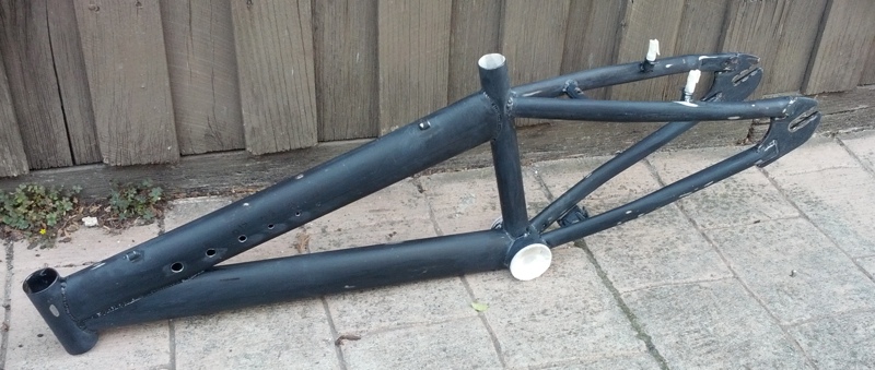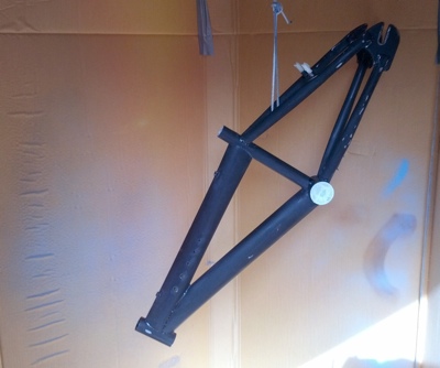 The original frame wasn’t really that much to look at either so I drilled some graduated holes in it to give it something a bit different then sanded the whole lot down. Once clean and grease free it was time for a paint job. Powdercoat was out due to expense. So rattle cans it was.
