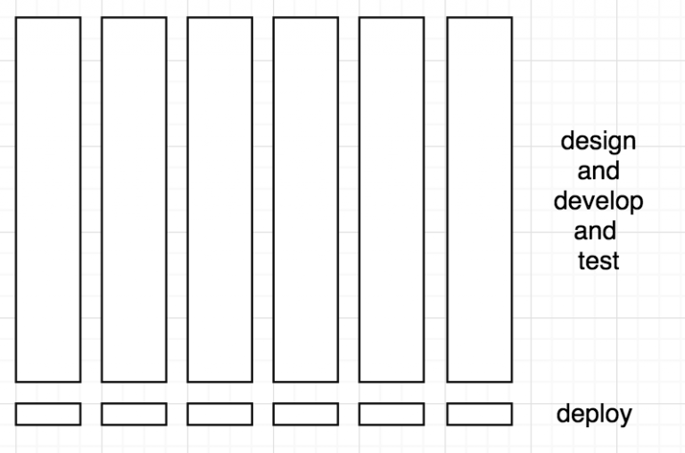 3. Deploy. Why bother deploying incrementally? Cause for most of the time you just spent developing you’ve made something that doesn’t actually do anything. That is, something that doesn’t work until the last minute. And you know what that is? That’s waterfall. That’s what that is. You can see that in the diagram, thats the “test all the things work together” bit.